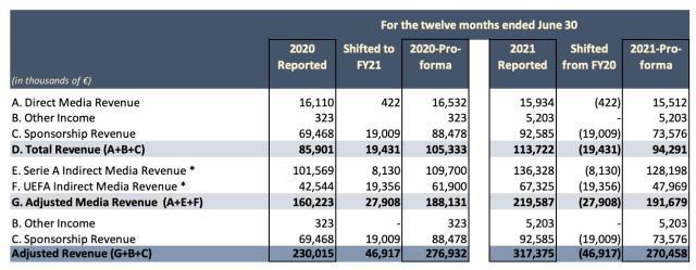 另一方面,上赛季意甲因新冠空场进行,让本来场均上座率和门票收入都位居意甲桂冠的国米遭受惨重损失。国米官方在财报中表示,新冠为球队直接带来的经济损失在1.1亿左右,其中4000万来自赞助权益受限导致的赞助损失,7000万则来自比赛日的收入流失——按照此前年度国米的财报数据,门票收入归零带来的损失应当在4500万左右,其余的与周边销售等进项相关。